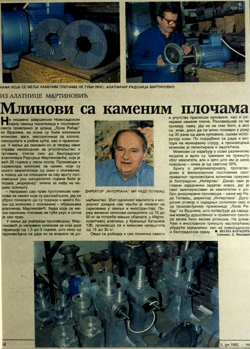 Decenijama je Radojica Martinović čekao dan kada ce saopštiti da je njegova alatnica, do juče, zanatska radnja u kojoj je proizvodio mlinove za kafu, vage i mesoreznice, počinje serijsku proizvodnju mlinova za kafu sa kamenim meljačima i praktično prerasta u prvo privatno preduzeće u kojem će se izrađivati mlinovi za kafu za pržionice, male, srednje i velike samoposluge.